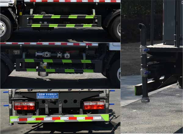 該車用途為抑塵降霾.主要裝置為罐體及噴霧裝置;罐體有效容積:3.98立方米,罐體外形尺寸(×長軸×短軸)(mm):2900×1650×1200;ABS型號/廠家:ABS/ASR-12V-4S/4M/襄陽東風隆誠機械有限責任公司,側、后防護材料均為:Q235碳鋼,連接方式均為:螺栓連接,后部防護截面尺寸(mm):120×50,后部防護離地高度(mm):390;隨底盤選裝駕駛室,選裝噴霧裝置樣式,選裝底盤附件位置。隨底盤選裝燃油箱,電瓶,尿素罐,儲氣筒左右安裝位置,選裝噴灑裝置樣式。