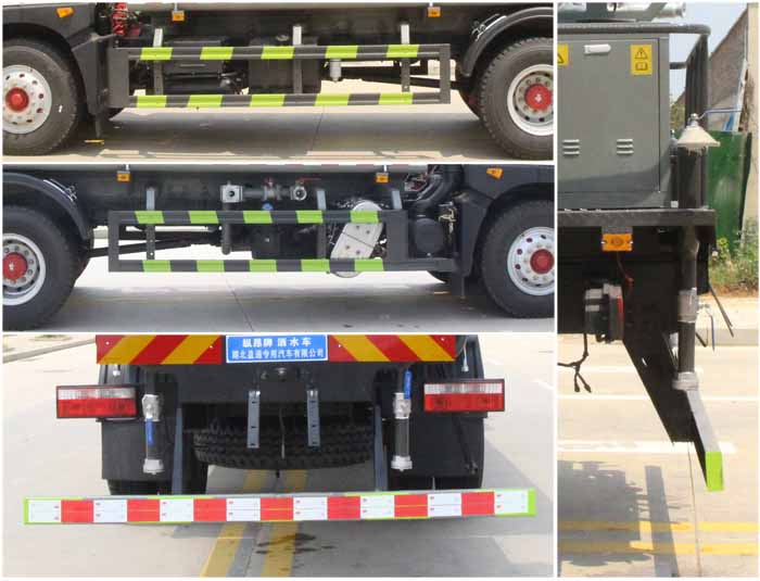 該車主要用于城鄉(xiāng)園林綠化噴灑作業(yè);主要裝置為水罐及噴灑裝置;罐體總?cè)萘?/span>:10.7立方米;罐體有效容積:10.2立方米;罐體外形尺寸(×長軸×短軸)(mm):4800×2300×1300.ABS系統(tǒng)生產(chǎn)廠家,型號:焦作博瑞克控制技術(shù)有限公司,J ABS;襄陽東風(fēng)隆誠機械有限責(zé)任公司,ABS/ASR-24V-4S/4M.側(cè)、后防護材料均為:Q235碳鋼,連接方式均為:螺栓連接,后部防護截面尺寸(mm):120×50,后部防護離地高度(mm):480.隨底盤選裝限速裝置,限速89km/h.隨底盤選裝燃油箱,電瓶,尿素罐,儲氣筒左右安裝位置,選裝噴霧裝置樣式.選裝箭頭燈裝置,選裝前部電子水炮裝置樣式,選裝前部不帶電子水炮;當(dāng)前部帶電子水炮時,前伸500mm,整車長度為9100mm,8550mm;當(dāng)前部不帶電子水炮時,前伸為0mm,整車長度為8600mm,8050mm.選裝罐體頂部高位花灑裝置及方形罐口,選裝尾部自流口裝置,選裝工具箱.采用底盤4500mm軸距改裝.后軸僅采用鋼板彈簧懸架.