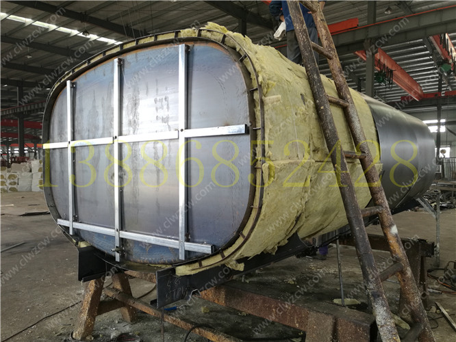 保溫熱水運輸車相比一般的灑水車在結構上多了一個保溫層,保溫層在制作上主要是在罐體外部先焊接一個支撐骨架,其厚度一般為100mm,然后再用保溫材料把骨架填充滿。在保溫材料的選擇上我們一般考慮導熱系數小,耐高溫,質量輕,吸聲性能好,絕緣性和化學穩定性好的硬質聚氨酷泡沫塑料或巖棉。然后需要對填充的保溫材料進行修正,盈通汽車后在骨架上撞上蒙板,蒙板一般使用厚度為lmm的鋁板。