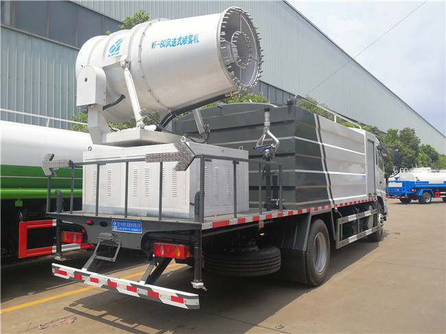 專用裝置為抑塵霧炮,用于城市抑塵。整車長/軸距/后懸對應關系為(mm):7890/3950/2540;8300/4200/2700;8700/4500/2800;9150/4700/3050;9150/4700/3020;9600/5000/3200;9900/5300/3200;10250/5800/3050.防護材料:Q235A碳鋼,連接方式:左右側面采用焊接連接。后下部防護采用螺栓連接,后部防護斷面尺寸(mm):120×50,后部防護離地高度(mm):490。ABS型號/生產廠家:3631010-C2000/東科克諾爾商用車制動系統(十堰)有限公司,ABS 8/東科克諾爾商用車制動系統(十堰)有限公司, 4460046450/威伯科汽車控制系統(中國)有限公司。隨底盤選裝駕駛室。選裝霧炮型號:WF-60/WF-80/WF-100所對應的整備質量分別為:9650kg/10600kg/11300kg。選裝外形圖片。選裝抽水口位置布局。
