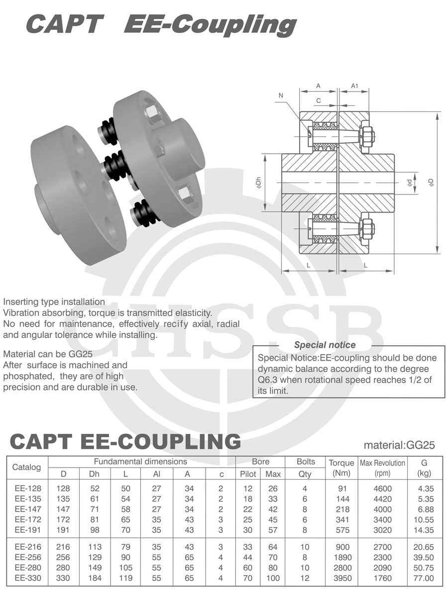 EE聯(lián)軸器插入式安裝;吸收震動(dòng),扭向彈性;免維護(hù),有效糾正軸向、徑向、角向的安裝偏差;材質(zhì)可選用